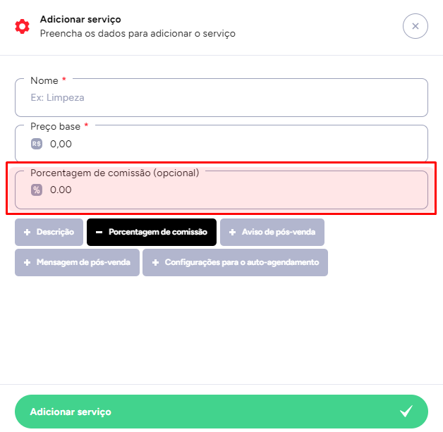 O sistema utilizará a porcentagem definida no serviço para calcular a comissão automaticamente.