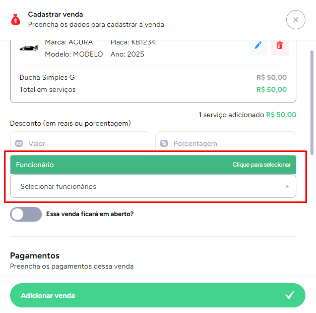 Ao cadastrar uma venda, você encontrará a opção para selecionar o funcionário responsável pelo atendimento.