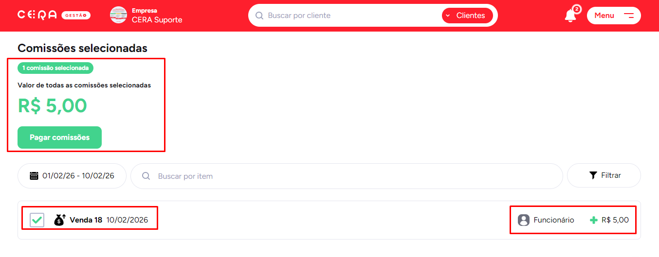 Após selecionar as comissões, clique em Pagar comissão.