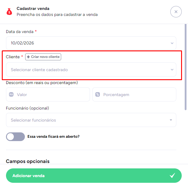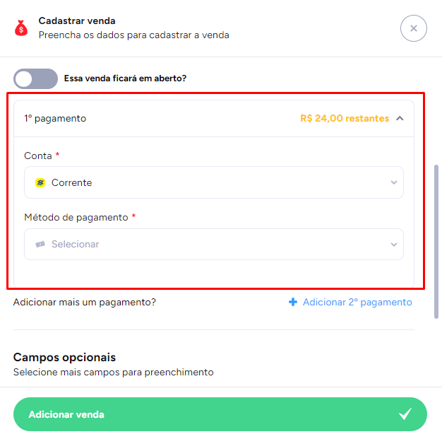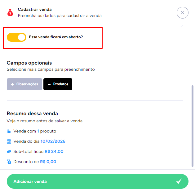 Clique em Essa venda ficará em aberto e em seguida clique em Adicionar venda