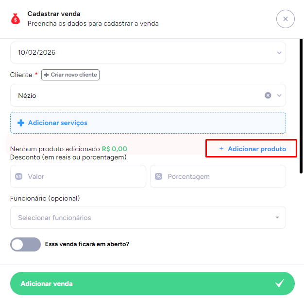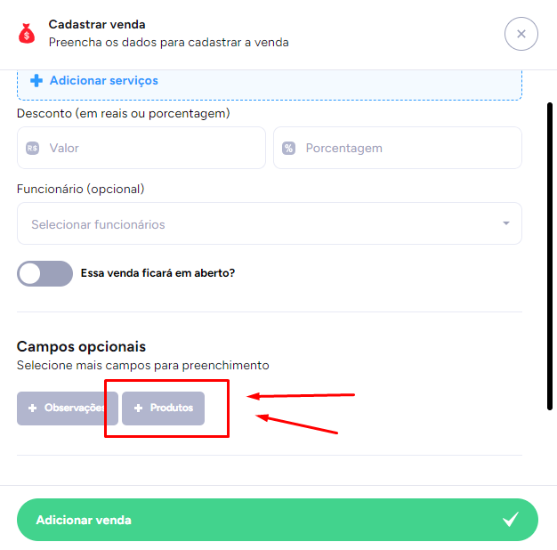 Após adicionar o cliente e os produtos, se tiver serviços para selecionar, é só clicar em + Adicionar serviços.