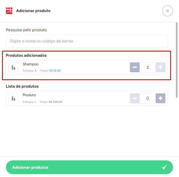 Após selecionar o Produto e a sua quantidade, clique em Adicionar produtos no final da tela.