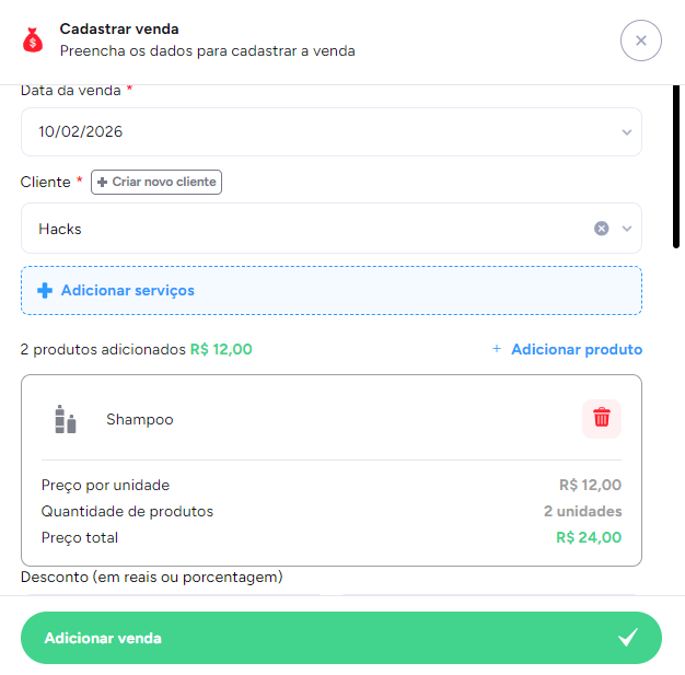 EX: Se eu vendi 2 produtos de Shampoo, eu clico no + 2 vezes.