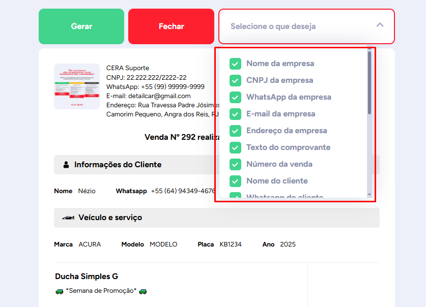 Você também pode personalizar o conteúdo que aparecerá no PDF, desmarcando o que não deseja incluir, como preço ou nome.