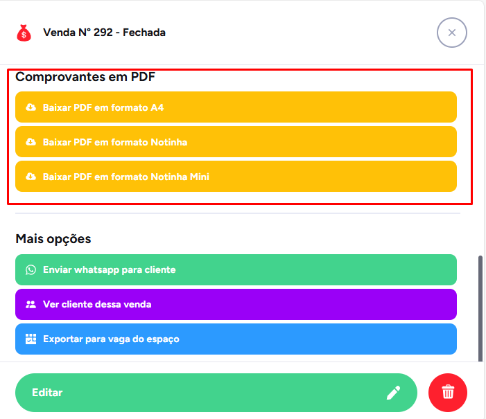 Há três formatos de PDF disponíveis: A4, Notinha e Notinha Mini. O formato A4 é um PDF maior, ideal para impressoras de escritório, o formato Notinha é feito para impressoras térmicas, e o Notinha Mini é para aquelas maquininhas bem pequenas. Escolha o formato de acordo com o que você prefere enviar.