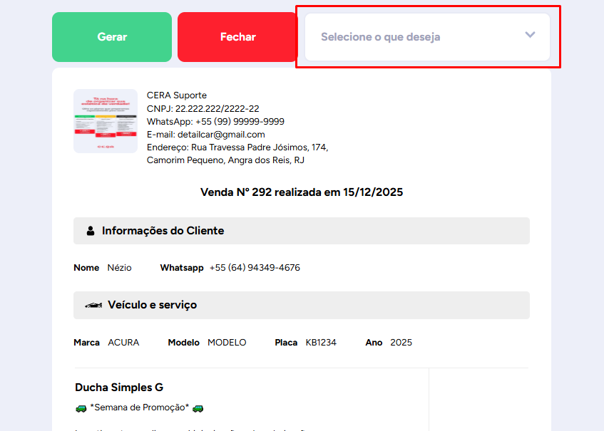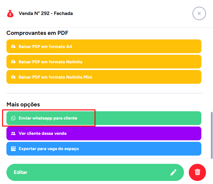 Para enviar um recibo para o cliente, primeiro selecione o que deseja enviar, como a venda, o orçamento, o agendamento ou a reserva de espaço. Clique no item escolhido; neste exemplo, será uma venda. Após abrir a venda, role a tela para baixo até encontrar as opções de formato de recibo.