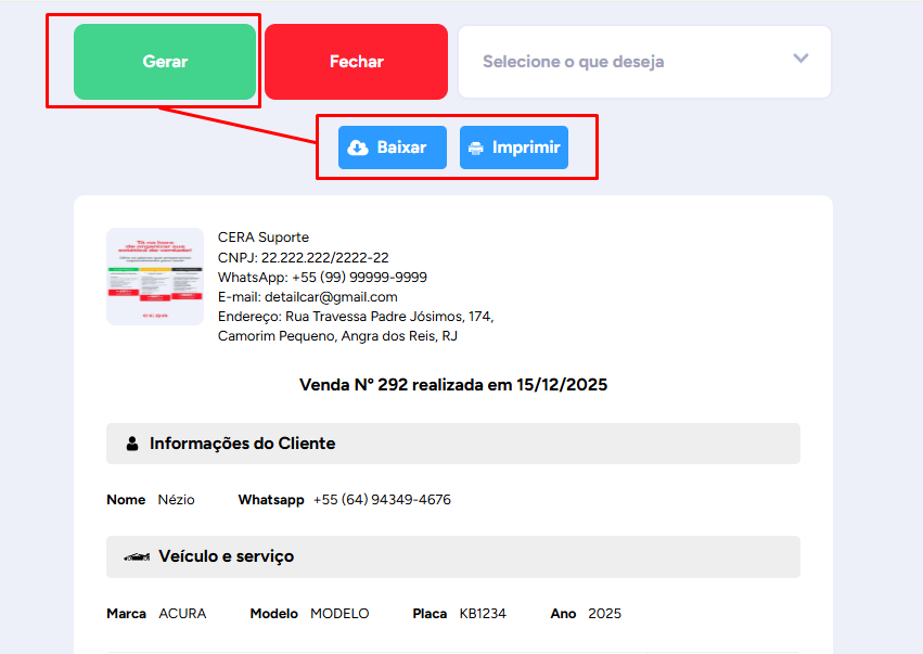 Depois de configurar o PDF, clique em “Gerar”. No celular, você verá a opção “Compartilhar”, permitindo selecionar o WhatsApp para enviar o arquivo direto para o cliente, caso tenha o contato dele salvo.