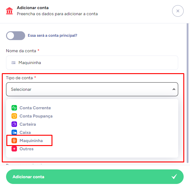 • Tipo de Conta: Selecione obrigatoriamente a opção Maquininha.
