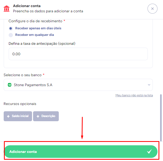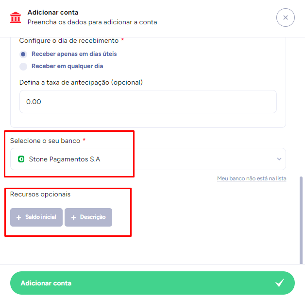 • Saldo inicial (Opcional): Utilize se já houver um valor a receber nesta conta.