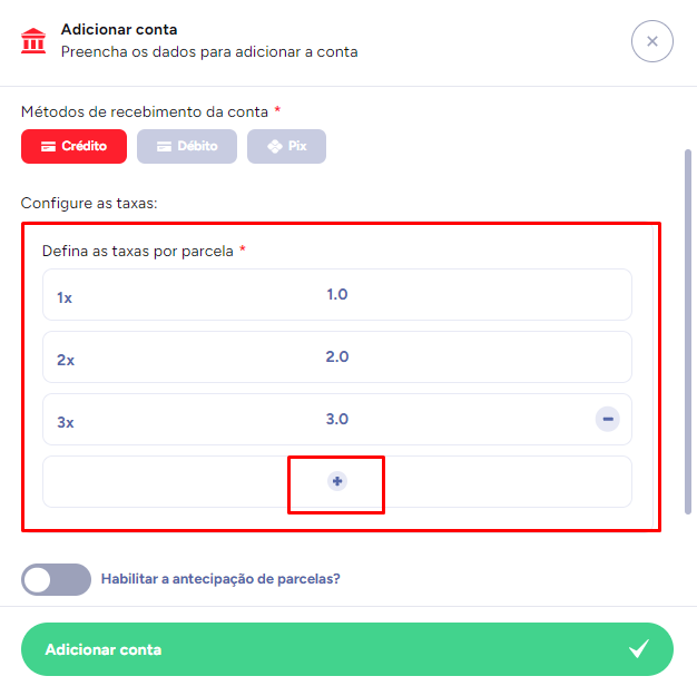 • Taxa de antecipação (opcional): Informe a taxa cobrada pela operadora para antecipar os valores.