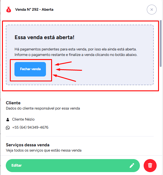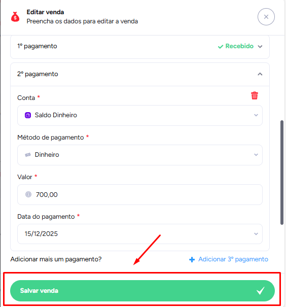 Quando o cliente pagar o restante, é só ir até a aba de vendas, localizar essa venda, clicar em Fechar venda , adicionar a nova forma de pagamento (pode ser a mesma ou outra), preencher o valor e salvar.