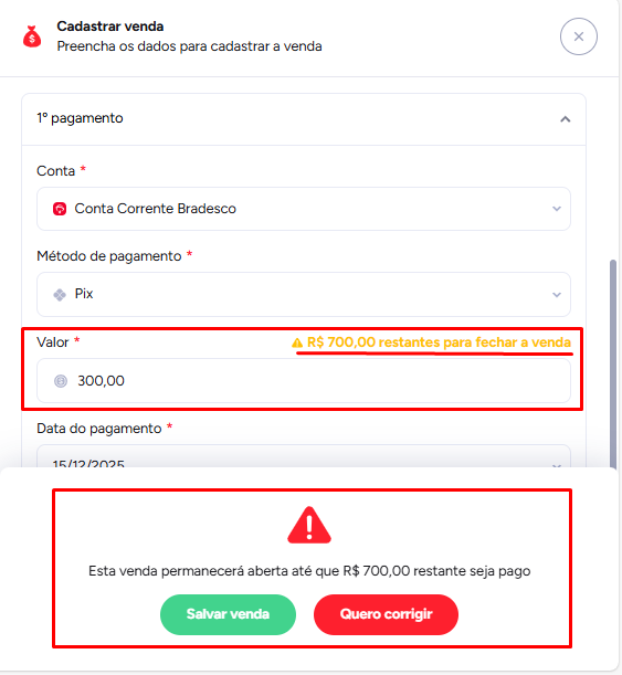Clique em salvar. O sistema vai avisar que ainda há um valor pendente, mas isso é normal — a venda vai ficar em aberto até ser totalmente quitada.