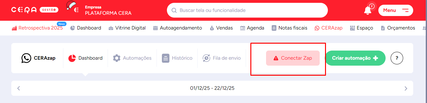 Na aba do CERAzap, clique na opção "Conectar zap".