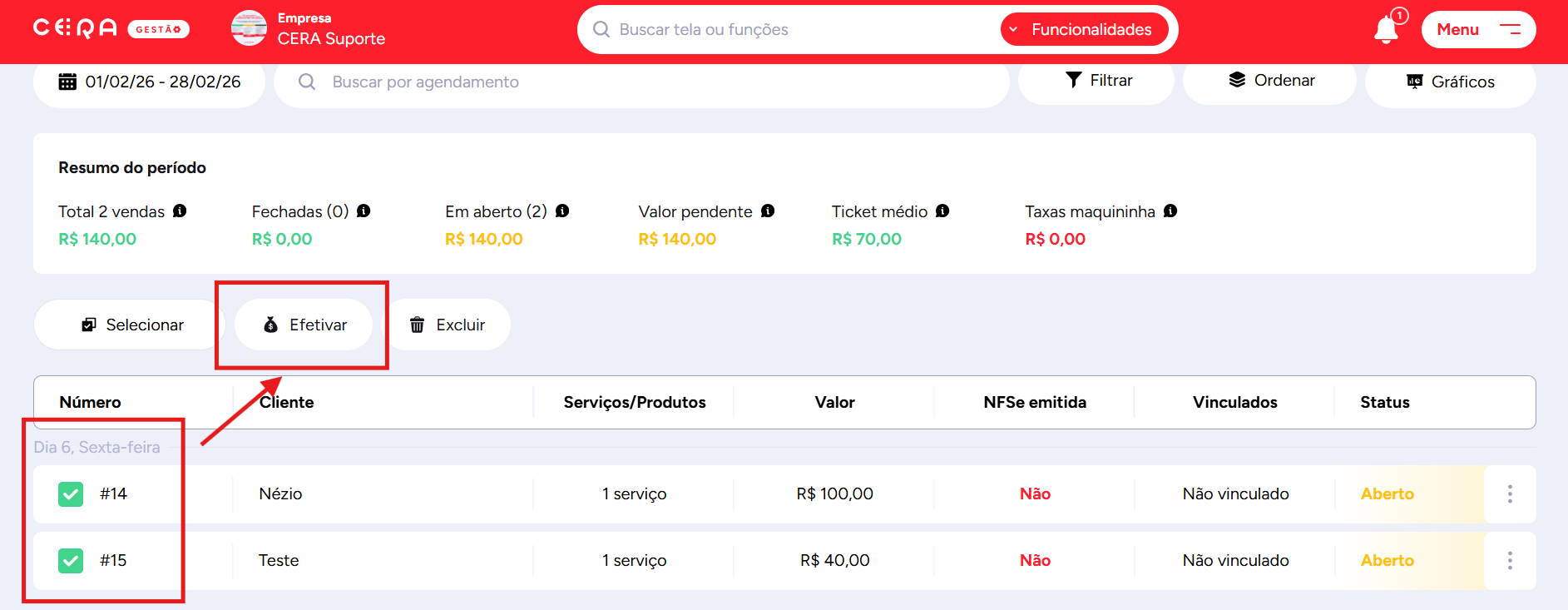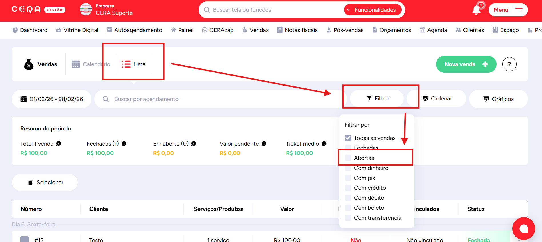 Uma vez fechadas, as vendas saem do status "Aberto" e alimentam seu financeiro automaticamente.