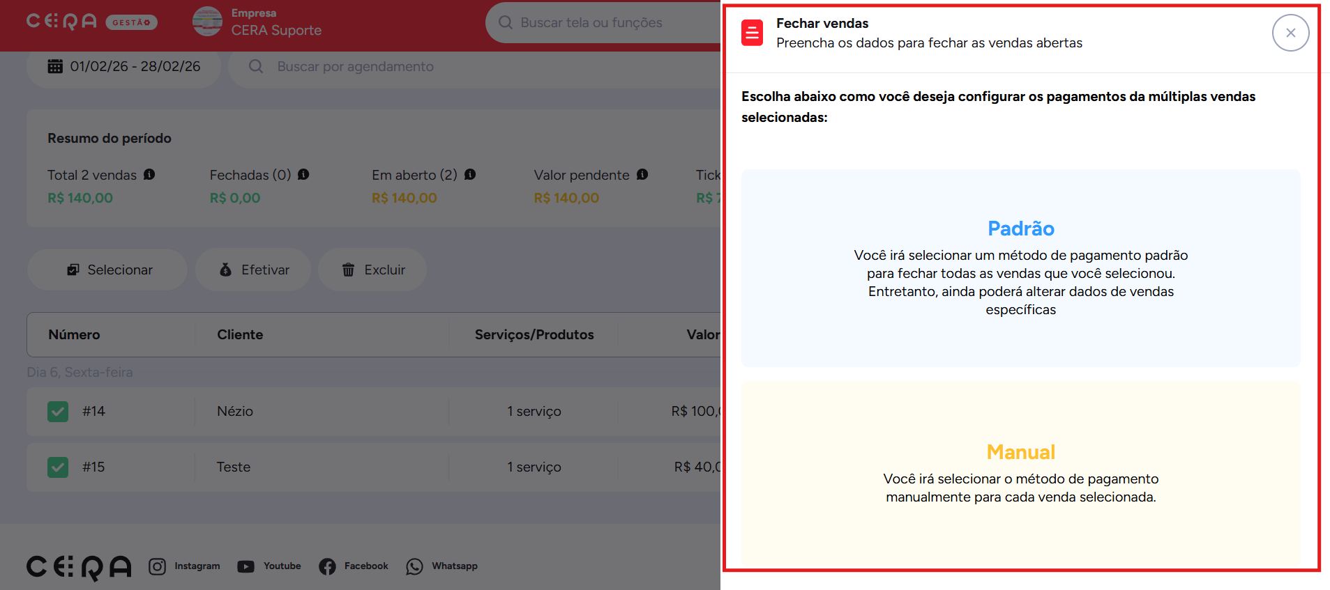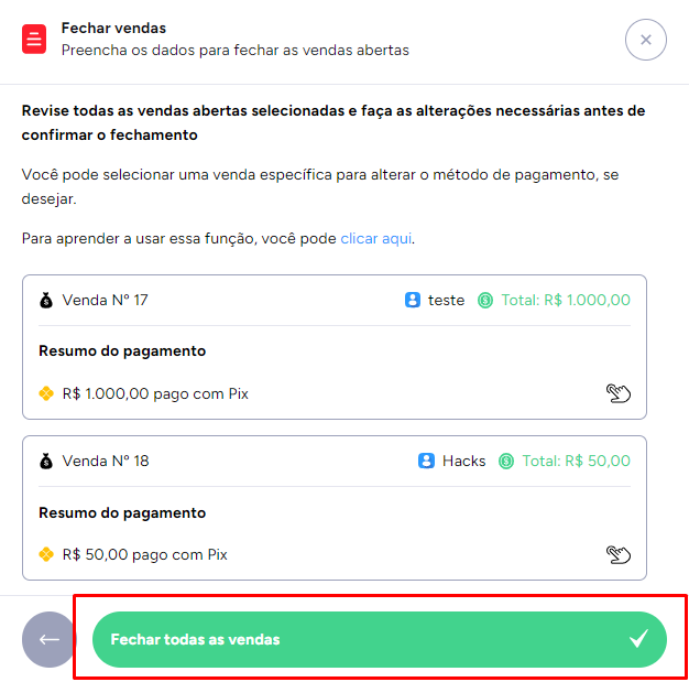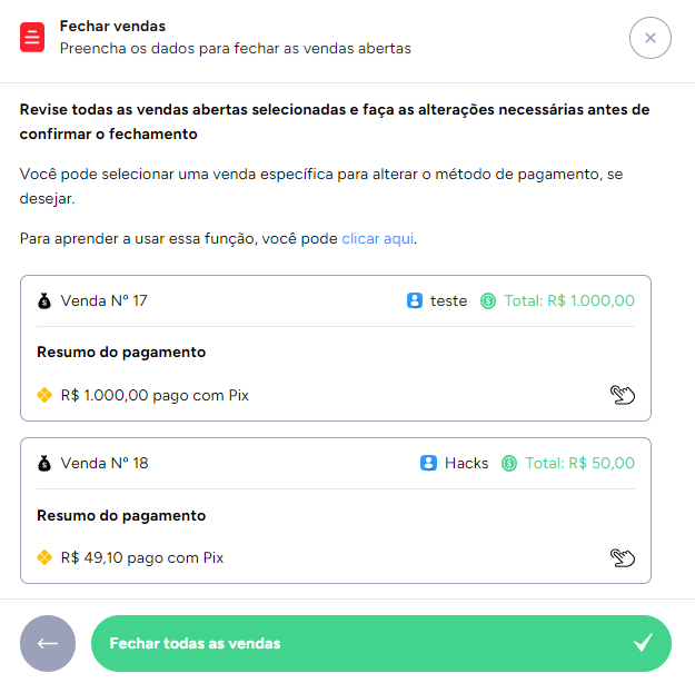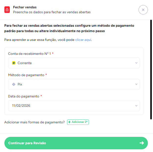 Utilize esta opção se todas as vendas selecionadas foram pagas da mesma forma.