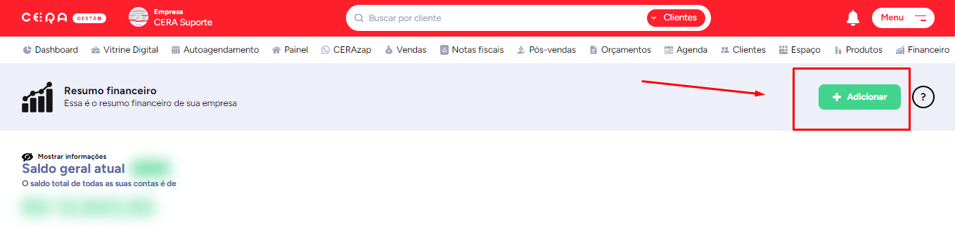 No Financeiro, clique em Adicionar e selecione Nova saída na conta. Siga o preenchimento nesta ordem:
