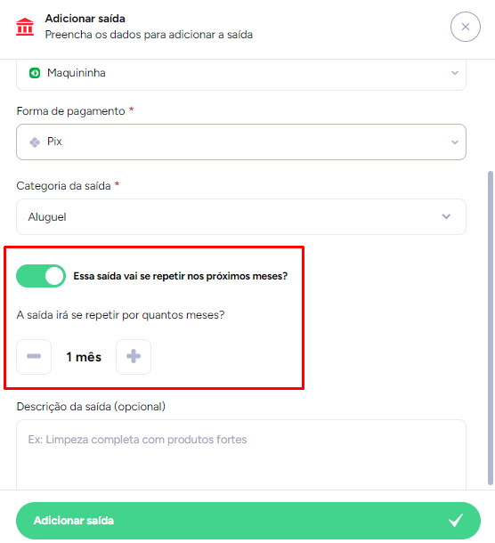 Contas Fixas (Recorrência): Se for uma conta que se repete todo mês com o mesmo valor (ex: Aluguel), marque a opção Essa saída vai se repetir nos próximos meses? e informe por quantos meses ela deve ser replicada.