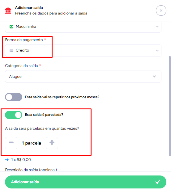 Compras Parceladas (Crédito): Caso a forma de pagamento selecionada seja Crédito, aparecerá a opção Essa saída é parcelada?. Ao marcar, você poderá definir em quantas parcelas o valor será dividido no seu financeiro.