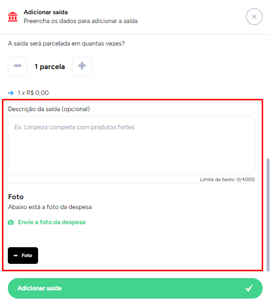 Finalização e Anexos: Adicione uma Descrição se necessário e anexe uma Foto do comprovante ou boleto para ter o registro guardado.